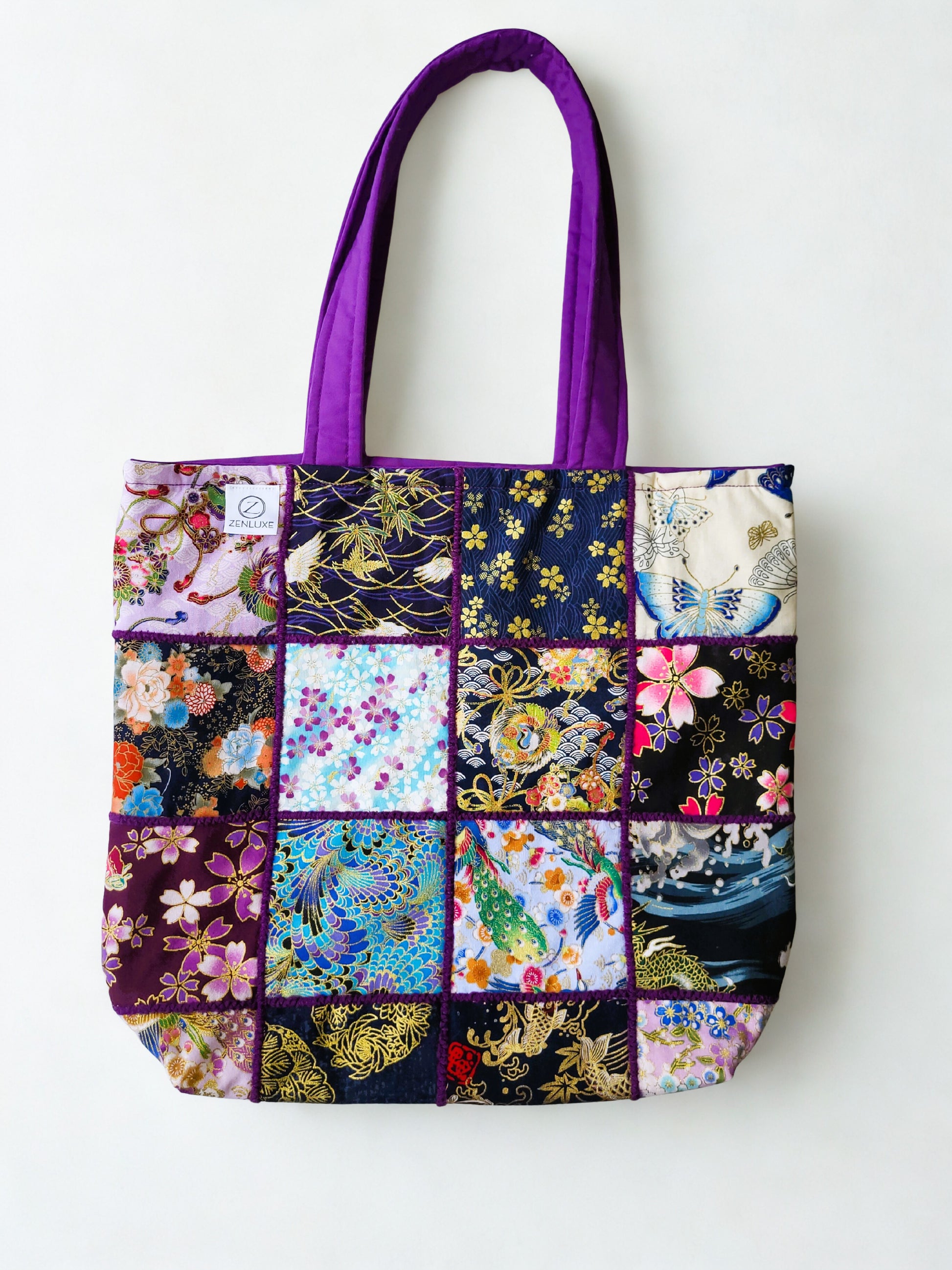 Carry your essentials in style with this charming Japanese-inspired patchwork tote. The front features a delightful mix of quilted fabric patches that tell their own story, while the plain purple back keeps things beautifully balanced. The plush padded construction keeps your belongings cozy and protected, while sturdy handles make it perfect for daily adventures—whether you're heading to the market, the office, or a weekend getaway. A delightful blend of function and artistry that turns everyday carrying into something special.